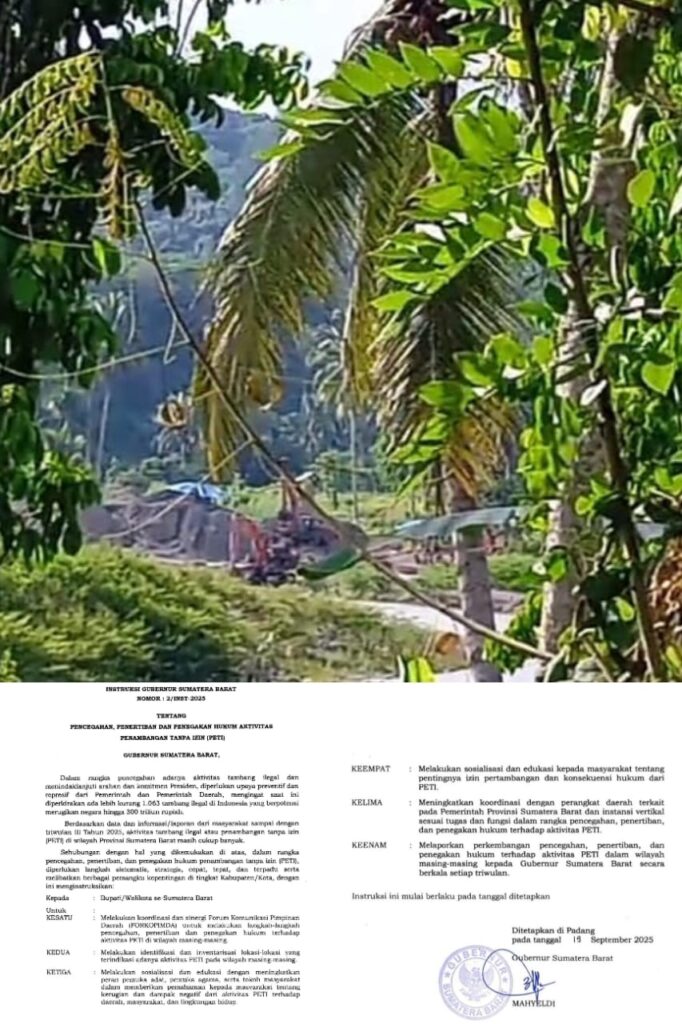 Untuk menindaklanjuti Instruksi Presiden tersebut, maka dikeluarkan Instruksi Gubernur Sumatera Barat Nomor : 2/INST-2025 tantang Pencegahan, Penertiban dan Penegakan Hukum Aktivitas Penambangan Tanpa Izin (PETI) yang mempunyai 6 (enam) poin instruksi, yang ditandatangani dan mulai berlaku tanggal 19 September 2025. Dalam Instruksi Gubernur Sumatera Barat tersebut intinya berisi larangan keras untuk melakukan aktivitas Penambangan Ilegal.