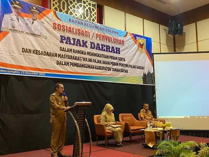 Tanah Datar (SUMBAR), HN- Bupati Tanah Datar Eka Putra membuka secara resmi sekaligus menjadi Keynote Speaker kegiatan Sosialisasi/Penyuluhan Pajak Daerah yang dilaksanakan Pemerintah Daerah (Pemda) Kabupaten Tanah Datar melalui Badan Keuangan Daerah (BKD) Kabupaten Tanah Datar, Selasa (13/12/2022) di Ballroom Emersia Hotel and Resort Batusangkar.