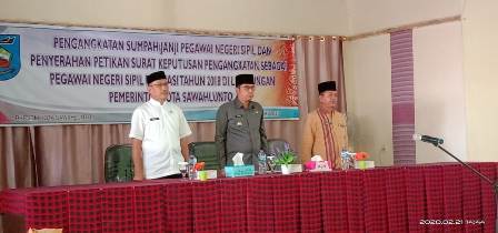 Hal tersebut disampaikan walikota sawahlunto Deri Asta, SH , pada saat Acara Pelantikan dan Pengangkatan Sumpah Janji Pegawai Negeri Sipil (PNS) Jum’at, 21 Februari 2020 yang digelar di Gedung SKB Kota Sawahlunto.