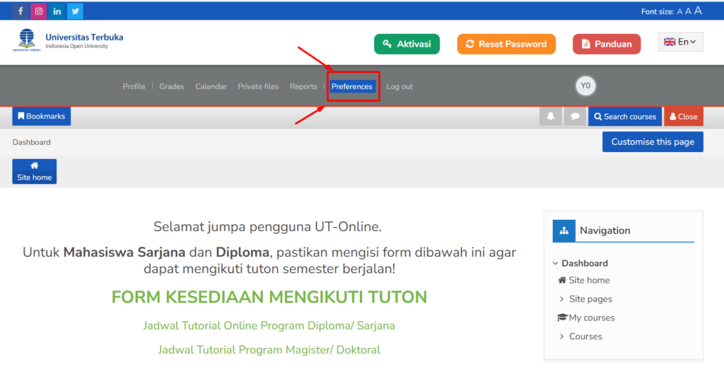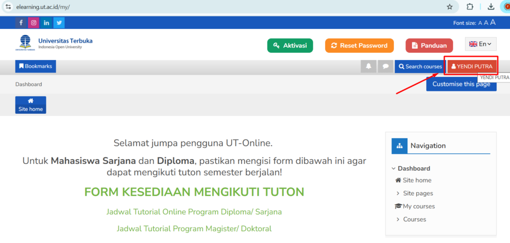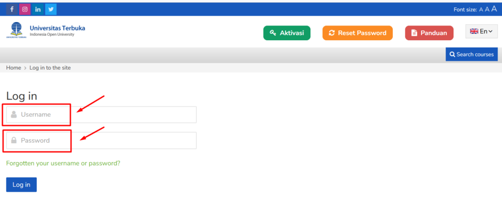 Kunjungi web https://elearning.ut.ac.id/login/index.php lalu Masukan username dan password lalu klik Login
