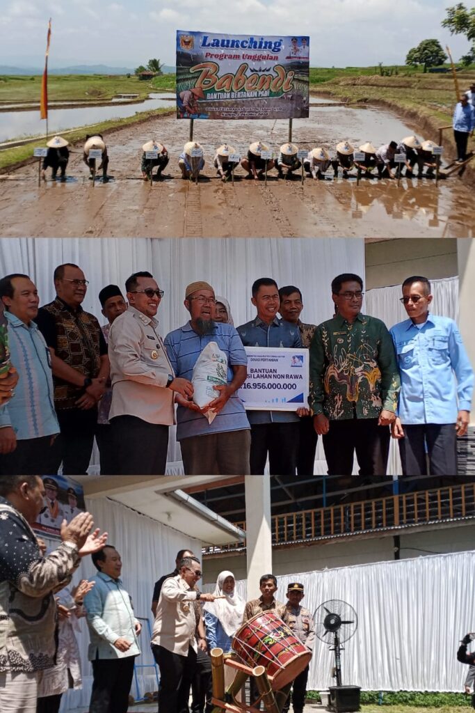 Selanjutkan Bupati Eka Putra melakukan pemukulan gendang sebagai tanda dilaunchingnya secara resmi Progul Babendi (Bantuan Bertanam Padi) serta demonstrasi penanaman padi di lahan yang telah disediakan.